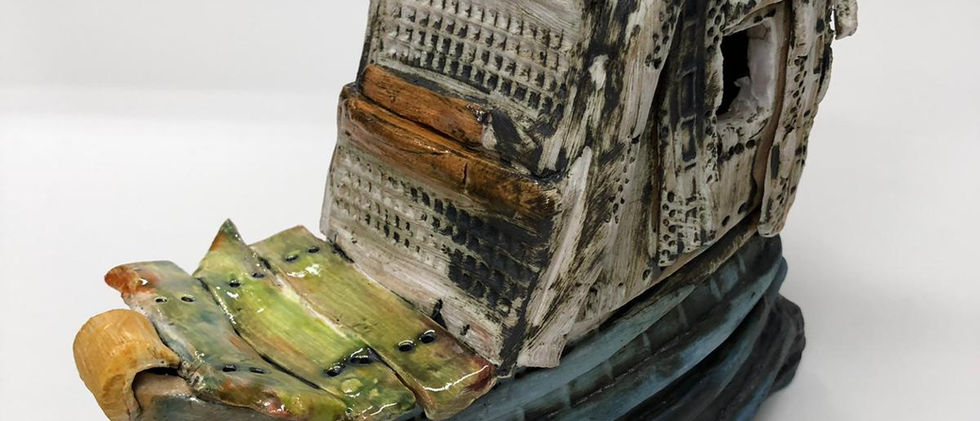 This new work then, with its collage of textures and shapes that lead the viewer to consider the makers intentions and the implausibility of the piece as a functioning vessel, resonate on a deeper level when we take on concepts of survival, shelter and protection.